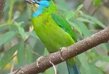 蓝喉拟啄木鸟,是须鴷科、拟啄木鸟属的鸟类。蓝喉拟啄木鸟为小型鸟类,体长20-23厘米。前额至头顶鲜红色,其上有一宽阔的黑色横带,将此红色分为前后二块;头侧、颏、喉蓝色,下喉两侧各具一红色点斑。…全部>>