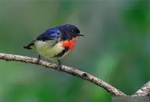 红胸啄花鸟:体重5-10克,体长60-92毫米。体形纤小。雄鸟上体呈辉亮的金属绿色;下体棕黄,胸部具一朱红色块斑,极易与其他啄花鸟区别。雌鸟上体呈橄榄绿,下体棕黄色。虹膜褐色,嘴褐黑色或角灰色,…全部>>