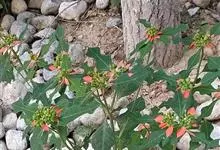 猩猩草:常绿或半常绿灌木,盆栽时株高0.5米-2米,在亚热带地区可长到6米以上。茎直立而光滑,单叶互生,卵状椭圆形至阔披针形,具不规则的深缺刻。长10-15厘米。花小,有蜜腺,排列成密集的伞房花序。…全部>>