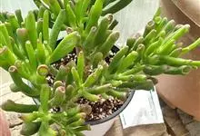 筒叶花月,是景天科青锁龙属的多年生草本植物。植株多分株,灌木状,茎较粗壮,圆柱形,表皮灰褐色;叶片肉质,互生,呈圆筒状,簇生于茎或分枝顶端,叶端呈斜截形,截面为椭圆形;花呈星状,淡白色;花期秋季。…全部>>