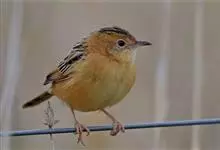金头扇尾莺体小而具褐色纵纹的莺。嘴细长,略向下弯;翼短,体型娇小,尾长。下体皮黄,喉近白,尾深褐,尾端皮黄。雌雄羽色相近,羽色单调。繁殖期雄鸟顶冠亮金色,腰褐色。雌鸟及非繁殖期雄鸟头顶密布黑色细纹,…全部>>