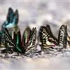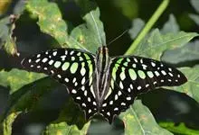 碎斑青凤蝶是凤蝶科、青凤蝶属昆虫。体背面黑色,具绿毛,腹面淡白色。翅黑褐色,斑纹淡绿色或浅黄色;前翅中室有5个斑纹排成1列;后翅基半部有5-6个大小不同的纵斑。后翅亚外缘的斑列加宽,…全部>>