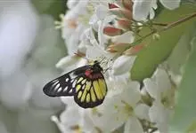 报喜斑粉蝶是粉蝶科斑粉蝶属的一种动物,又名红肩粉蝶、藤粉蝶等。幼虫群集性很强,从同一卵块孵化出的幼虫,幼龄期全部群集在一起取食,高龄幼虫常分散成小群。幼虫群集危害叶片,造成秃枝,严重者可将树吃成光杆,…全部>>