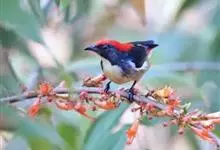 朱背啄花鸟:体重6-8克,体长81-97毫米。是一种小型的黑色及红色啄花鸟。雄鸟顶冠、背及腰猩红色,两翼、头侧及尾黑,两胁灰,下体余部白色。雌鸟上体橄榄色,腰及尾上覆羽猩红,尾黑。亚成鸟清灰色,嘴橘黄,…全部>>
