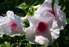 粉花凌霄 K.Schum.)是紫葳科魔盒凌霄属的落叶藤本植物。奇数羽状复叶对生,小叶全缘,呈椭圆形至披针形;顶生圆锥形花序,花冠白色或粉红色,喉部红色,呈漏斗状、花萼不膨大;蒴果木质,…全部>>