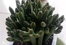 筒叶花月,是景天科青锁龙属的多年生草本植物。植株多分株,灌木状,茎较粗壮,圆柱形,表皮灰褐色;叶片肉质,互生,呈圆筒状,簇生于茎或分枝顶端,叶端呈斜截形,截面为椭圆形;花呈星状,淡白色;花期秋季。…全部>>