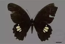 玉斑凤蝶Papilio helenus 别名白纹凤蝶,是凤蝶科凤蝶属美凤蝶亚属大型种类。雌雄同型;体翅皆黑色,后翅正面中室外有3个并列的白色斑,亚外缘有1列模糊的新月形红色斑,…全部>>