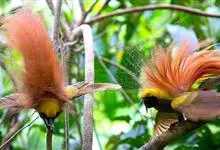 大极乐鸟是极乐鸟属中最大的鸟种。成年雄鸟体长可达到43厘米,雌性可达35厘米。雄鸟的额、颊、喉等墨绿色;头、颈黄色;上体暗赤栗色;腹部葡萄红色,胁部有长饰羽,其基部橙黄,中部黄色,…全部>>