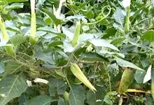 洋金花是茄科曼陀罗属植物,一年生草本植物,全株近于无毛。茎直立,圆柱形,高30~100cm,基部木质化,上部呈义状分枝。叶互生,上部的叶近于对生;叶柄长2~6cm,表面被疏短毛;叶片卵形、长卵形或心形,…全部>>