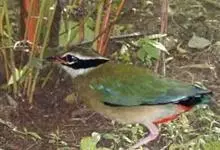 绿胸八色鸫:是雀形目八色鸫科的鸟类,共有12个亚种。体长为16-18厘米,体重65-69克。体型圆胖,尾短,腿长。头黑,上体绿色,两翼深色而具白色斑纹,头顶至后枕深褐,胸及腹部苹果绿,臀亮红。…全部>>