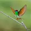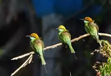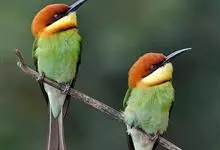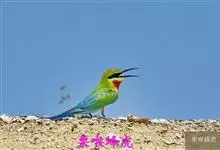 栗喉蜂虎是蜂虎科蜂虎属的鸟类。有热带鸟类羽毛艳丽的特征:喉部是栗红色的,黑色的过眼纹,翅膀和背部是绿色的,尾翼是蓝色的,飞行时翅膀下面的羽毛是橙黄色的,在阳光的照射下,它们全身闪烁着金属般的艳丽光泽,…全部>>