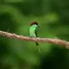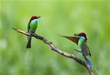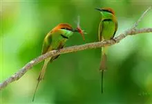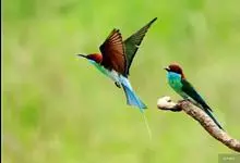 绿喉蜂虎是佛法僧目、蜂虎科的小型鸟类,共有9个亚种。身长22-25厘米,翼展29-30厘米,体重15-20克。喉绿色,额部、头顶至上背为锈红色,其余上体均为亮绿色。中央尾羽延长且端段狭细,…全部>>