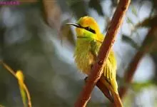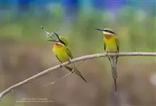 黄喉蜂虎属中型鸟类,体长23-30厘米。喉黄色,其下有一窄的黑色胸带;胸带以下的整个下体蓝绿色。前额蓝白色,具一宽的黑色贯眼纹,头顶至后颈暗栗色,尾蓝绿色,中央尾羽延长,明显突出于其他尾羽。…全部>>