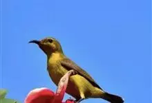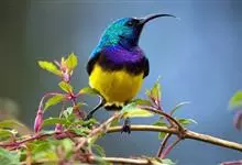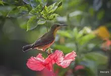 黄腹花蜜鸟是雀形目太阳鸟科花蜜鸟属鸟类。体型较小、喙略短而弯、腹部黄色。雄鸟繁殖季节颏及胸黑紫色并泛金属光泽,具有绯红色及灰色胸带,将上腹部黑色斑与前胸隔开,肩斑为橙黄色丝质羽,上体橄榄绿色,…全部>>