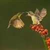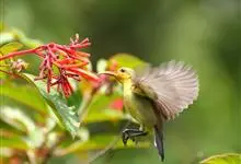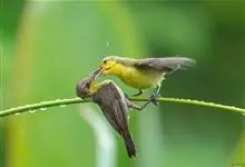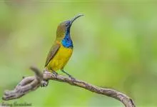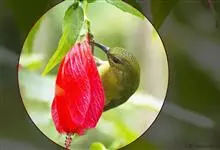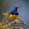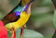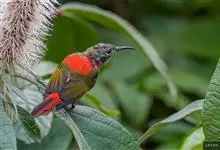 绿喉太阳鸟:共有9个亚种。小型鸟类,雄鸟体长13-15厘米、雌鸟10-12厘米。雄鸟前额至后颈、颏和喉辉绿色,头侧黑色,颈侧和背暗红色,两肩、下背橄榄绿色,腰鲜黄色,尾上覆羽和中央尾羽暗绿色,…全部>>