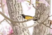 黄腹花蜜鸟是雀形目太阳鸟科花蜜鸟属鸟类。体型较小、喙略短而弯、腹部黄色。雄鸟繁殖季节颏及胸黑紫色并泛金属光泽,具有绯红色及灰色胸带,将上腹部黑色斑与前胸隔开,肩斑为橙黄色丝质羽,上体橄榄绿色,…全部>>