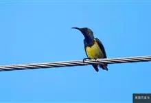 叉尾太阳鸟,雀形目太阳鸟科太阳鸟属留鸟;为小型鸟类,雄鸟头顶辉蓝绿色,上体橄榄绿色,腰明黄色,中央尾羽亮翠蓝色,羽轴针状延长,外侧尾羽黑色具白色端斑,头侧黑色,颜、喉和胸为绛红色,…全部>>