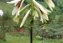 大百合 Makino)是百合科大百合属的多年生草本植物。小鳞茎卵形;叶纸质,网状脉,基生叶卵状心形或宽,茎生叶卵状心形;总状花序,花狭喇叭形,内具淡紫红色条纹,花丝向下渐扩大,子房圆柱形;蒴果近球形,…全部>>