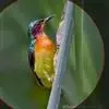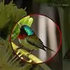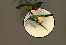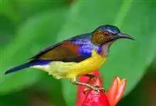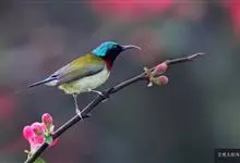 绿喉太阳鸟:共有9个亚种。小型鸟类,雄鸟体长13-15厘米、雌鸟10-12厘米。雄鸟前额至后颈、颏和喉辉绿色,头侧黑色,颈侧和背暗红色,两肩、下背橄榄绿色,腰鲜黄色,尾上覆羽和中央尾羽暗绿色,…全部>>