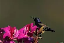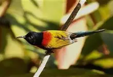 叉尾太阳鸟,雀形目太阳鸟科太阳鸟属留鸟;为小型鸟类,雄鸟头顶辉蓝绿色,上体橄榄绿色,腰明黄色,中央尾羽亮翠蓝色,羽轴针状延长,外侧尾羽黑色具白色端斑,头侧黑色,颜、喉和胸为绛红色,…全部>>
