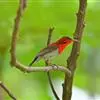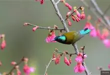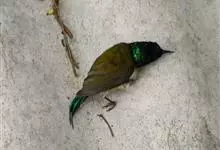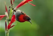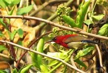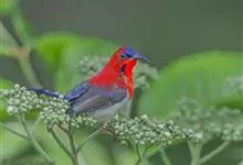 叉尾太阳鸟,雀形目太阳鸟科太阳鸟属留鸟;为小型鸟类,雄鸟头顶辉蓝绿色,上体橄榄绿色,腰明黄色,中央尾羽亮翠蓝色,羽轴针状延长,外侧尾羽黑色具白色端斑,头侧黑色,颜、喉和胸为绛红色,…全部>>