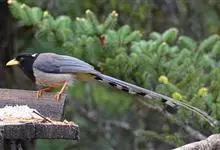 黄嘴蓝鹊是鸦科、蓝鹊属的鸟类。大型鸦类,体长45-69厘米。尾特长,呈凸状,蓝色,具黑色亚端斑和白色端斑。整个头、颈和上胸黑色,枕部有一白斑,其余上体紫蓝灰色。胸和上腹灰而沾紫蓝色,…全部>>