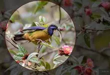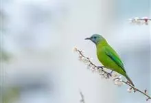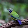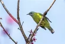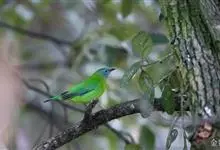 蓝翅叶鹎:小型鸟类,体长15-18厘米。雄鸟通体草绿色,尾蓝绿色,肩和翅亮蓝 色,胸缀有黄色,颏、喉黑色。雌鸟颏,喉蓝绿色。栖息在海拔1500米以下的常绿阔叶林、次生林和林缘疏林灌丛中。…全部>>