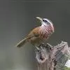 大噪鹛:中型鸟类,体长32-36厘米。额至头顶黑褐色,背栗褐色满杂以白色斑点,斑点前缘或四周还围有黑色。初级覆羽、大覆羽和初级飞羽具白色端斑。尾特长,均具黑色亚端斑和白色端斑。颏、喉棕褐色,…全部>>