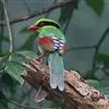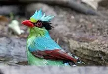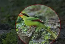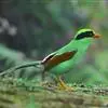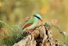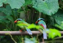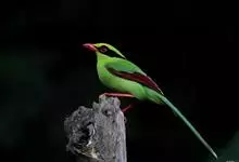 蓝绿鹊:中型鸟类,共有5个亚种。体长36-38厘米。尾长,嘴、脚红色。通体羽色主要为草绿色,宽阔的黑色贯眼纹向后延伸到后颈,在绿色的头侧极为醒目。两翅栗红色,内侧飞羽具黑色次端斑和白色尖端。尾绿色,…全部>>