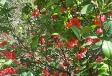贴梗海棠Nakai)是蔷薇科、木瓜海棠属植物。落叶灌木,高达2米,枝条直立开展,有刺。叶片卵形至椭圆形,稀长椭圆形,长3-9厘米,宽1.5-5厘米。花先叶开放,3-5朵簇生于二年生老枝上。…全部>>