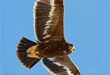 棕尾鵟:是鹰科鵟属的中大型猛禽,体长50-65厘米,体重1280克。成鸟头、颈棕褐色,上体褐色;第2-5枚初级飞羽外翈具横斑;下体棕白色;尾部棕褐色,与其他种类的鵟不同。飞行时,翅上举呈“V”形,…全部>>