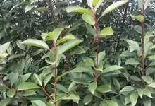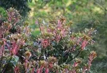 红叶石楠 是蔷薇科,石楠属杂交种,为常绿小乔木或灌木,乔木高可达5米、灌木高可达2米。叶片革质,长圆形至倒卵状、披针形,叶端渐尖,叶基楔形,叶缘有带腺的锯齿,花多而密,复伞房花序,花白色,梨果黄红色,…全部>>