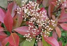 石楠 Kalkman),是蔷薇科石楠属的常绿乔木,高5~12米,株型紧凑,树冠圆球形。树枝为褐灰色;鳞片为褐色,没有毛;叶片革质,长椭圆至侧卵状椭圆形,有锯齿,新叶红色光亮。复伞房花序,白色小花,…全部>>