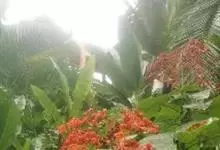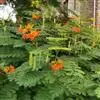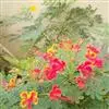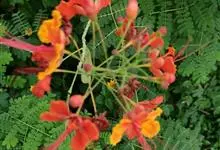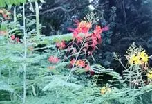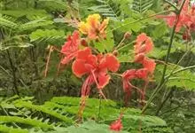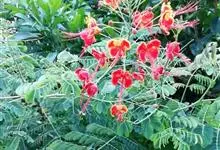 洋金凤 Sw.),豆科小凤花属灌木状或小乔木植物,枝无毛,绿或粉绿色;二回羽状复叶;总状花序伞房状,萼片无毛,花瓣橙红或黄色,圆形,花丝红色,子房无毛,花柱橙黄色;荚果窄而薄,…全部>>