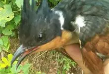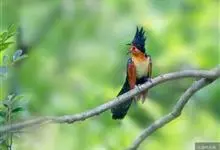 红翅凤头鹃:体长约38厘米,顶冠及凤头黑色,具显眼的直立凤头,背及尾黑色而带蓝色光泽,翅栗红色,喉及胸橙褐色,颈圈白色,腹部近白。虹膜淡红褐色。嘴黑色,下嘴基部近淡土黄色,嘴角肉红色,脚铅褐色。…全部>>