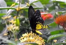 金裳凤蝶是凤蝶科、裳凤蝶属的动物。金裳凤蝶身体呈黑色,头、颈和胸侧有红毛,腹部有黑黄两色相间条纹,雄蝶前翅黑色,具黑天鹅绒光泽,各脉两侧灰白色,后翅金黄色,各室外缘有等腰三角形黑斑1枚,斑内侧有晕,…全部>>