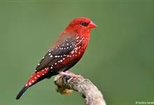 红梅花雀小型鸟类,体长9-10厘米。雄鸟通体朱红色,背、肩、胸等满布白色小斑点,两翅和尾黑褐色均具白色端斑,嘴红色,脚蜡黄色。雌鸟上体淡褐色或赭褐色,翅上中覆羽、大覆羽和内侧飞羽末端具白色斑点,…全部>>