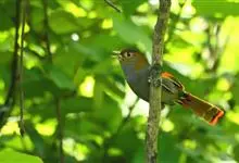 灰胸薮鹛是噪眉科、薮鹛属小型鸟类。体长15-20厘米。头顶灰色,前额和眉纹、后颈和颈侧橘黄色,耳羽和下体灰色,腹中黄色。上体灰橄榄黄色,飞羽黑色具红色和黄色翅斑。尾橄榄褐色具黑色横斑和红色端斑,…全部>>