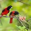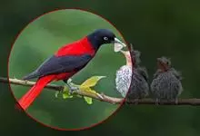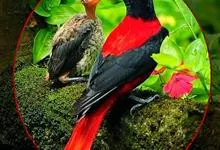 朱鹂:中等鸟类,体长23-28厘米。雄鸟绛紫红色,头、上胸及翼黑色。雌鸟上背及背部深灰色,尾覆羽及尾绛紫红色,腹部及下胸白而密布黑色纵纹。与鹊色鹂幼鸟的区别在上背灰色较深,下体白色较少且纵纹较粗。…全部>>