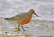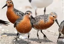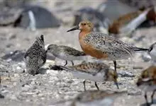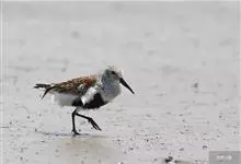 红腹滨鹬,是鹬科、滨鹬属的小型涉禽,体长23-25厘米,嘴较短而直、黑色,脚亦甚短、绿色。体较粗胖。夏季上体灰褐色具黑色中央纹,背具棕栗色和白色斑纹和羽缘,头侧和整个下体栗红色。冬季棕红色消失,…全部>>