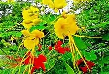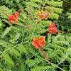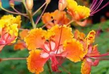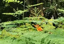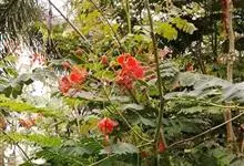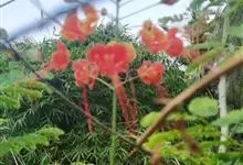 洋金凤 Sw.),豆科小凤花属灌木状或小乔木植物,枝无毛,绿或粉绿色;二回羽状复叶;总状花序伞房状,萼片无毛,花瓣橙红或黄色,圆形,花丝红色,子房无毛,花柱橙黄色;荚果窄而薄,…全部>>