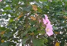 木芙蓉,锦葵科木槿属落叶灌木或小乔木。小枝上有细绒毛;叶片为卵状心形,托叶为披针形,常早落;花单生,花萼为钟形,花冠初为白色或淡红色,后逐渐变为深红色;果实为扁球形,有淡黄色的毛附着。花期8到10月。…全部>>