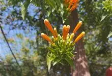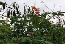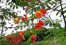 洋金凤 Sw.),豆科小凤花属灌木状或小乔木植物,枝无毛,绿或粉绿色;二回羽状复叶;总状花序伞房状,萼片无毛,花瓣橙红或黄色,圆形,花丝红色,子房无毛,花柱橙黄色;荚果窄而薄,…全部>>