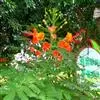 洋金凤 Sw.),豆科小凤花属灌木状或小乔木植物,枝无毛,绿或粉绿色;二回羽状复叶;总状花序伞房状,萼片无毛,花瓣橙红或黄色,圆形,花丝红色,子房无毛,花柱橙黄色;荚果窄而薄,…全部>>