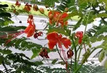 洋金凤 Sw.),豆科小凤花属灌木状或小乔木植物,枝无毛,绿或粉绿色;二回羽状复叶;总状花序伞房状,萼片无毛,花瓣橙红或黄色,圆形,花丝红色,子房无毛,花柱橙黄色;荚果窄而薄,…全部>>