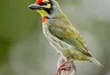 金喉拟啄木鸟,是须鴷科、拟啄木鸟属的鸟类。金喉拟啄木鸟为小型鸟类,体长19-24厘米。额深红色,头顶金黄色,后枕具一大块深红色斑,耳羽和头侧银灰色,上体草绿色,颏和上喉金黄色,下喉淡银灰色,…全部>>