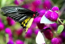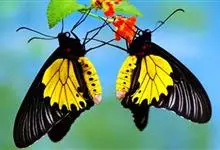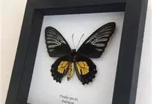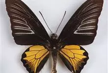 金裳凤蝶是凤蝶科、裳凤蝶属的动物。金裳凤蝶身体呈黑色,头、颈和胸侧有红毛,腹部有黑黄两色相间条纹,雄蝶前翅黑色,具黑天鹅绒光泽,各脉两侧灰白色,后翅金黄色,各室外缘有等腰三角形黑斑1枚,斑内侧有晕,…全部>>