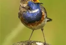 蓝点颏亦称“蓝喉歌鸲”,通称蓝靛颏儿。身体大小和麻雀相似,体长12-13厘米,体重17-18克。头部、上体主要为土褐色。眉纹白色。尾羽黑褐色,基部栗红色。颏部、喉部辉蓝色,下面有黑色横纹。下体白色。…全部>>