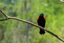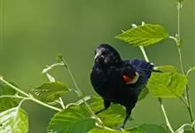 红翅黑鹂,是美洲黑鸟中最出名的是红翅黑鸟,体长19-24厘米,翼展30-37厘米,体重65克,春天雄鸟羽色翅膀上端橘红色连带小块白色,似大帅的红色肩章,头部及爪呈深蓝光泽,所有的羽毛都呈蓝黑色,…全部>>