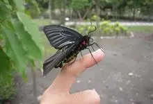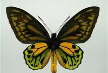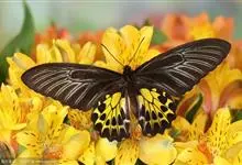 金裳凤蝶是凤蝶科、裳凤蝶属的动物。金裳凤蝶身体呈黑色,头、颈和胸侧有红毛,腹部有黑黄两色相间条纹,雄蝶前翅黑色,具黑天鹅绒光泽,各脉两侧灰白色,后翅金黄色,各室外缘有等腰三角形黑斑1枚,斑内侧有晕,…全部>>
